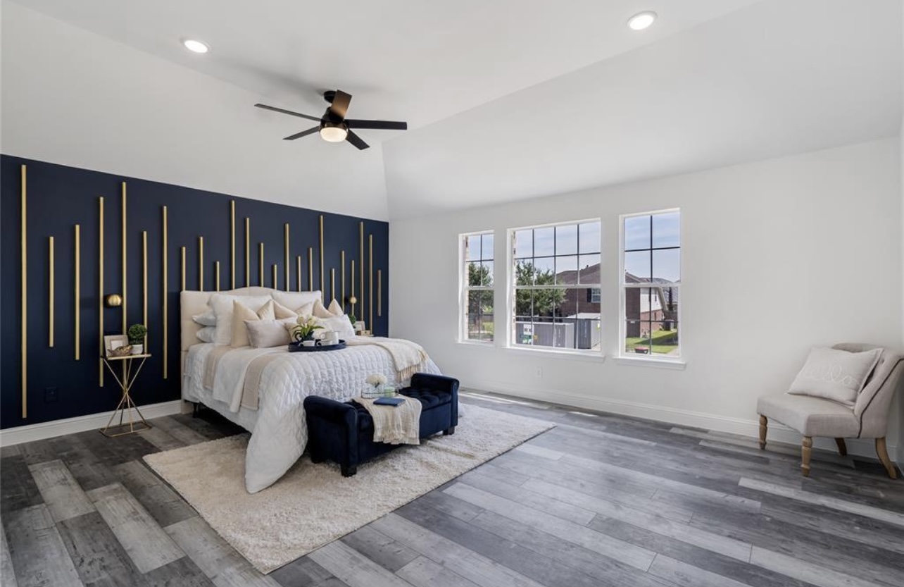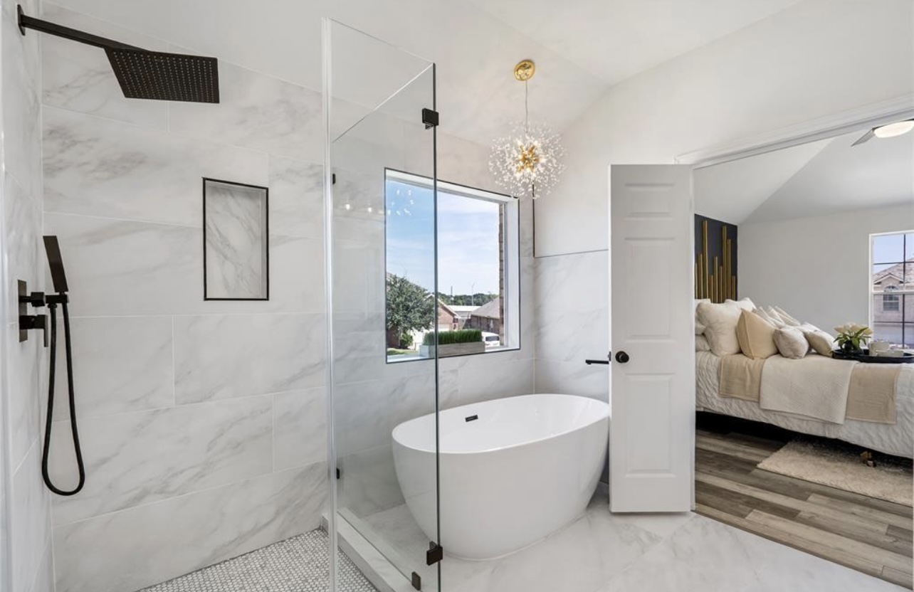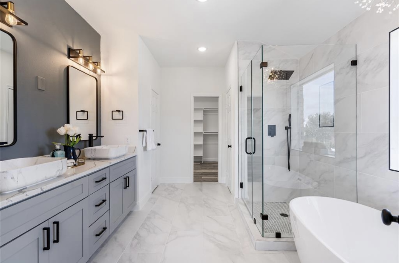 Every detail reflects intentional design, from the layered textures of the flooring to the subtle metallic accents that punctuate the primary suite. The bathroom’s spa-inspired finishes, sleek fixtures, and freestanding tub evoke resort-like serenity, while feature walls and lighting selections add architectural depth throughout.