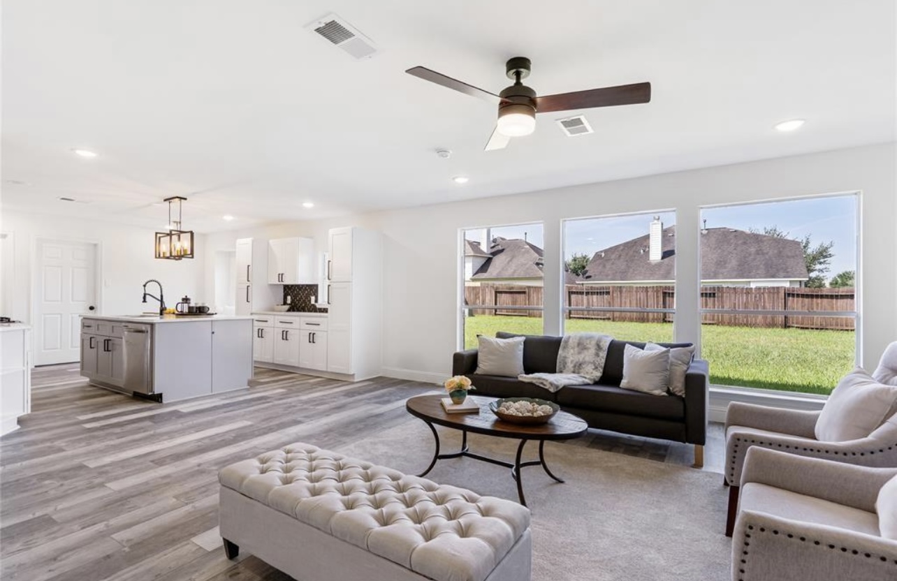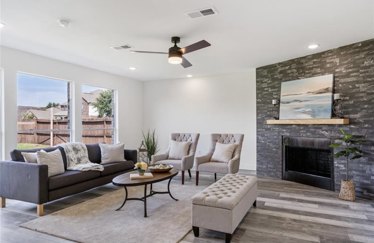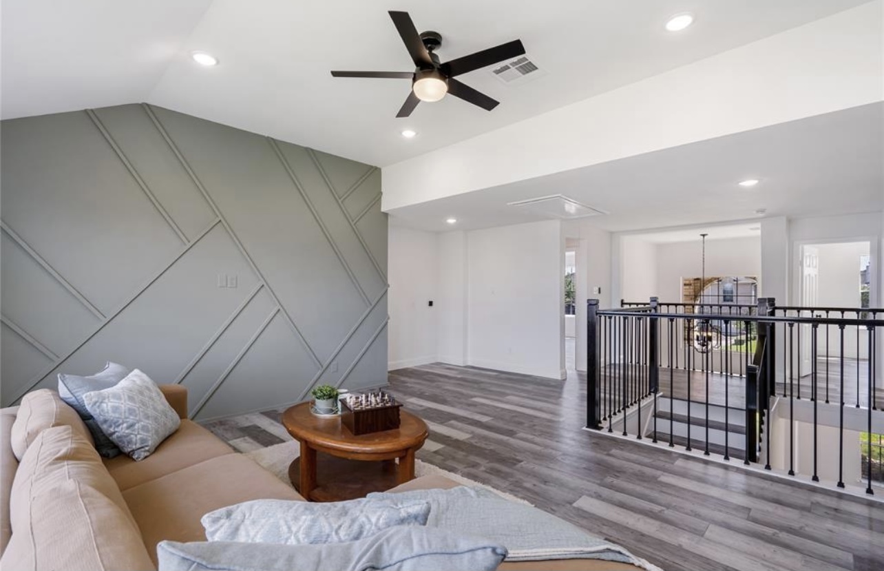 Every detail reflects intentional design, from the layered textures of the flooring to the subtle metallic accents that punctuate the primary suite. The bathroom’s spa-inspired finishes, sleek fixtures, and freestanding tub evoke resort-like serenity, while feature walls and lighting selections add architectural depth throughout.