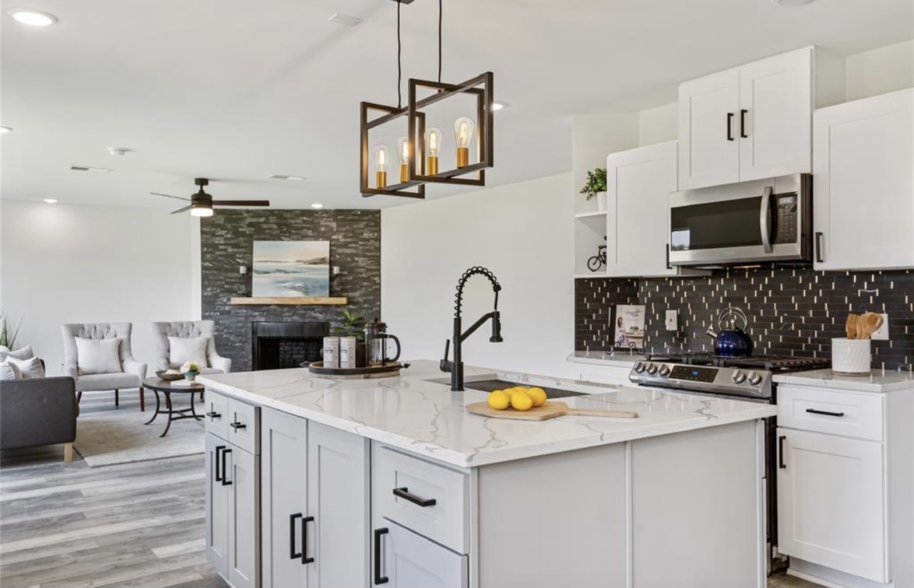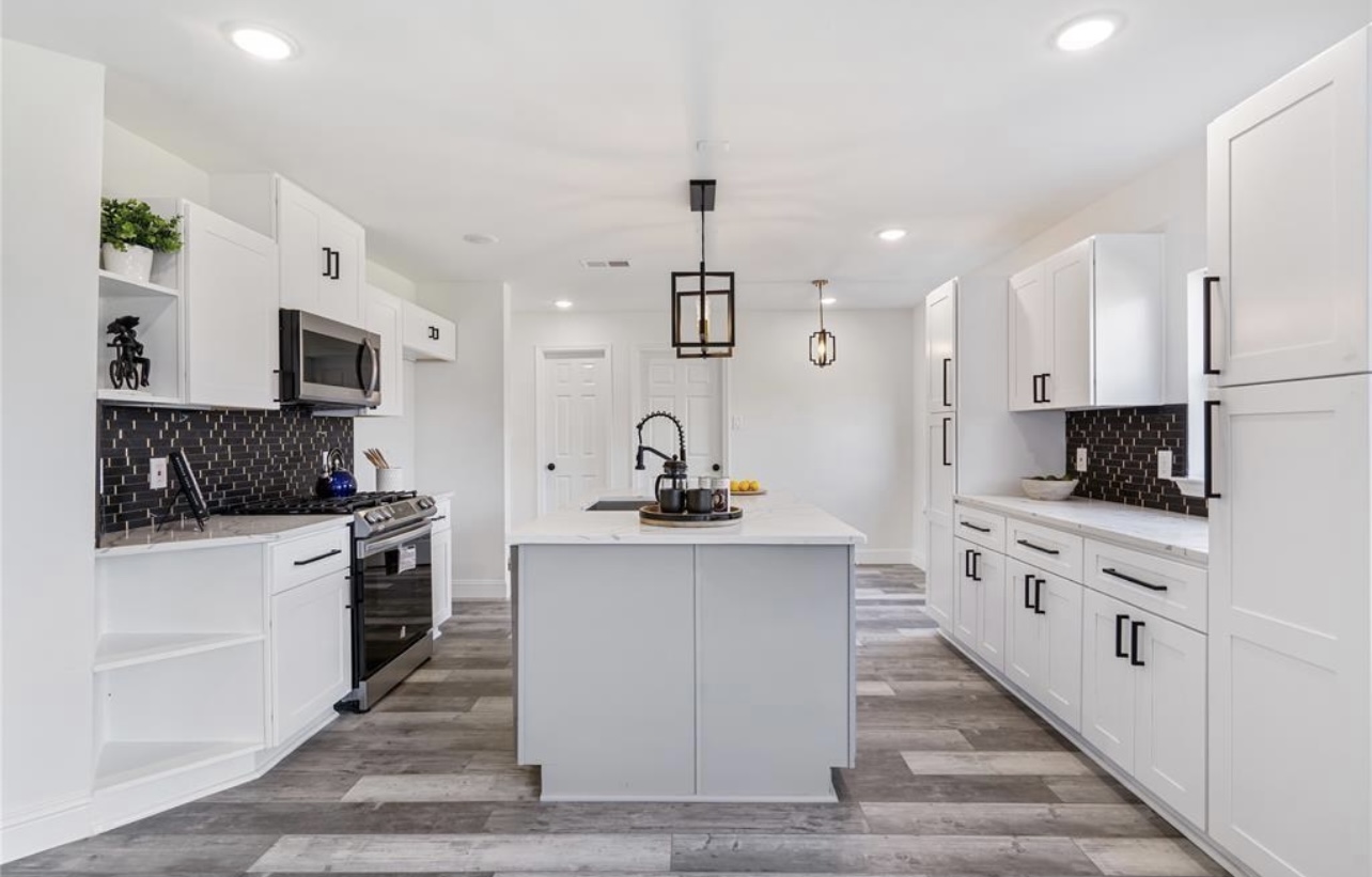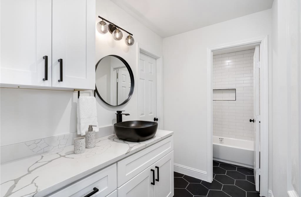 Walls were restructured to open the floor plan, allowing a seamless flow from the kitchen to the living and dining areas. The kitchen now serves as the home’s focal point, featuring custom white cabinetry, striking black tile accents, and a marble-inspired island that balances contemporary contrast with classic refinement.