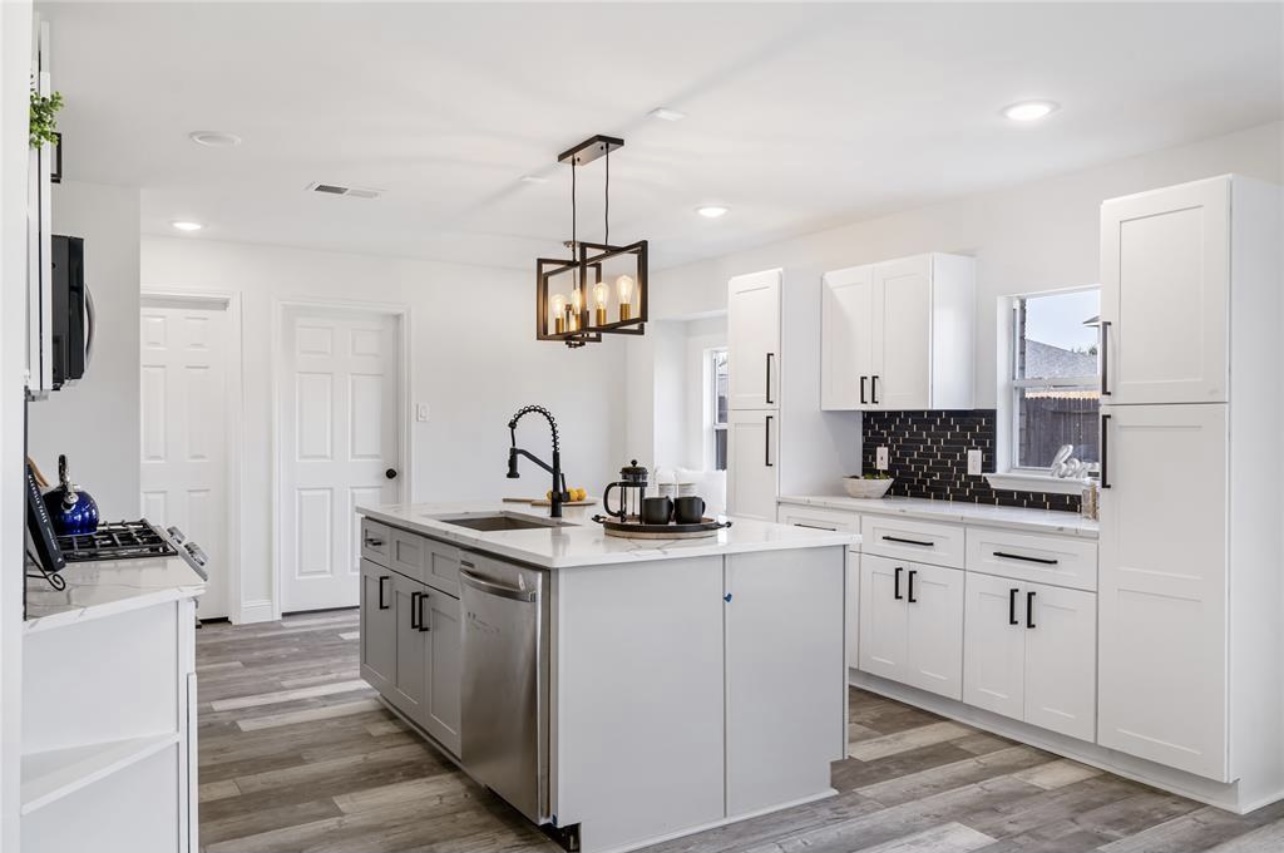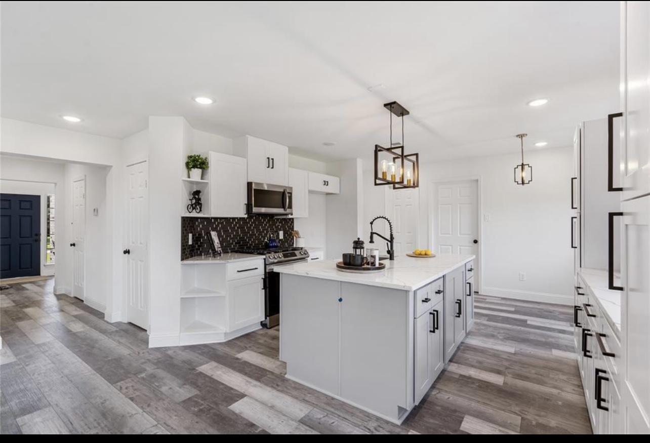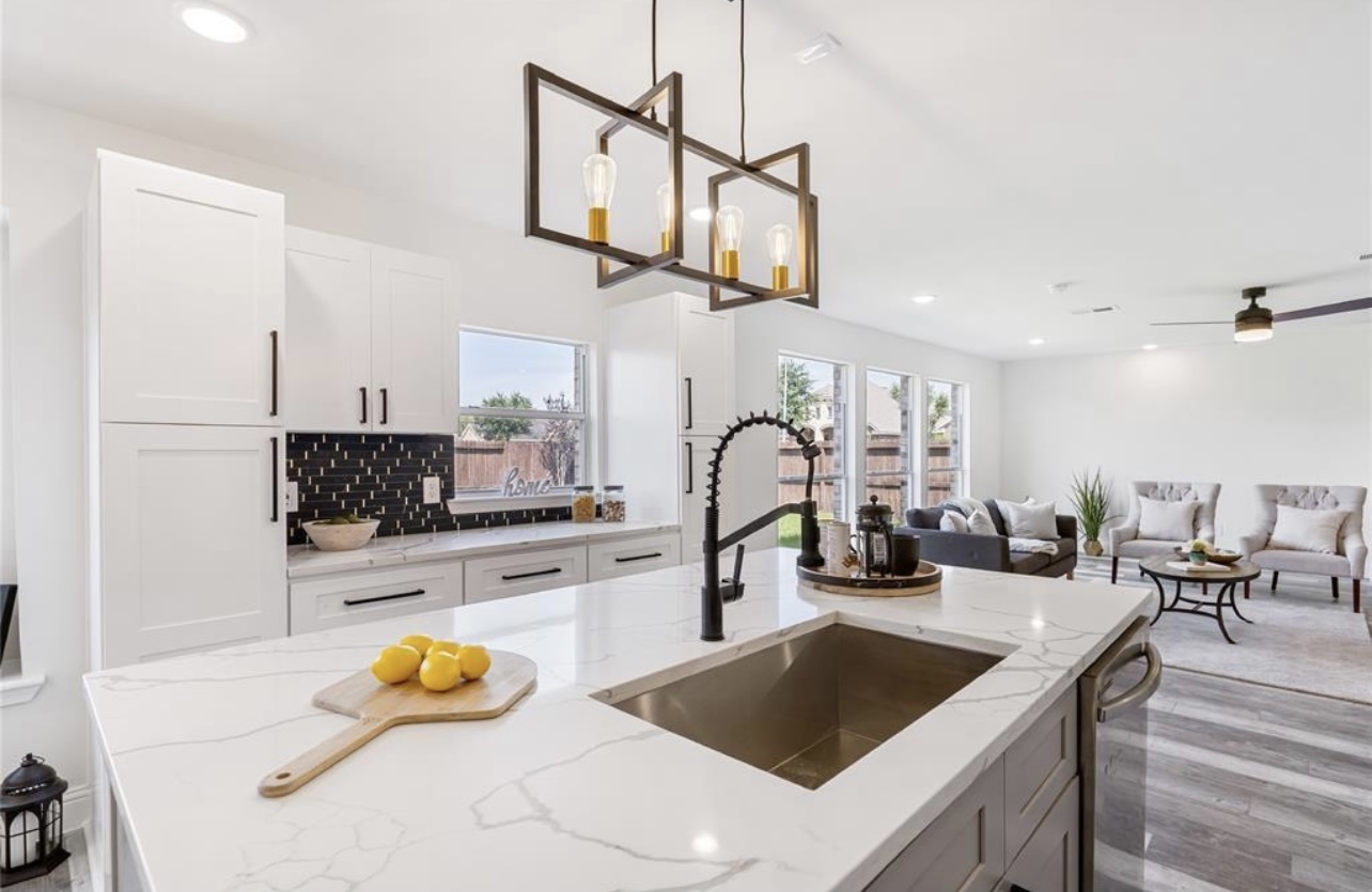 Walls were restructured to open the floor plan, allowing a seamless flow from the kitchen to the living and dining areas. The kitchen now serves as the home’s focal point, featuring custom white cabinetry, striking black tile accents, and a marble-inspired island that balances contemporary contrast with classic refinement.